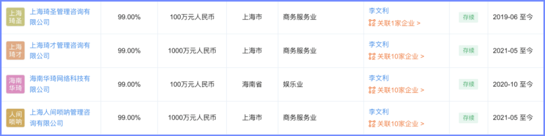 此外,李佳琦还有四家持股比例达到99%的企业,由持股1%的母亲李文利担任法人代表。