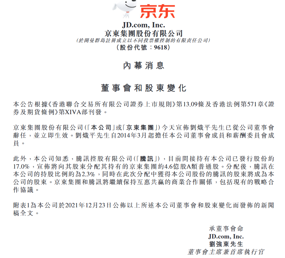 刚刚!腾讯宣布以中期派息方式,将所持有约4.6亿股京东股权发放给股东。本次派息后,腾讯对京东持股比例将由17%降至2.3%,不再为第一大股东,同时腾讯总裁刘炽平也将卸任京东董事。