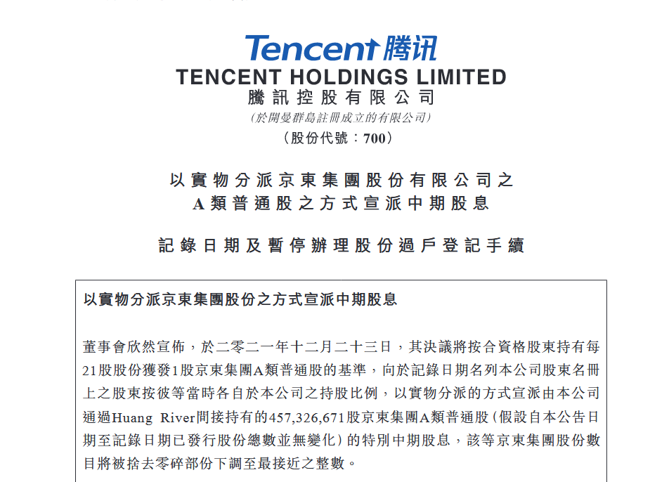 据腾讯公告,将按合资格股东持有每21股股份获发1股京东集团A类普通股的基准,向于记录日期名列本公司股东名册上之股东按彼等当时各自于本公司之持股比例,以实物分派的方式宣派由本公司通过Huang River间接持有的457,326,671股京东集团A类普通股(假设自本公告日期至记录日期已发行股份总数并无变化)的特别中期股息,该等京东集团股份数目将被舍去零碎部份下调至最接近之整数。