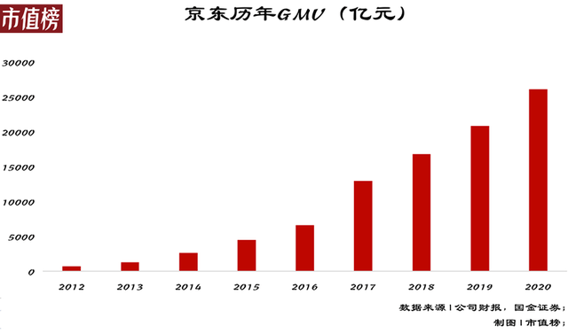 此后,京东走过了快速发展的几年,它的年度GMV从2012年的733亿元,增长到2020年的2.6万亿元。