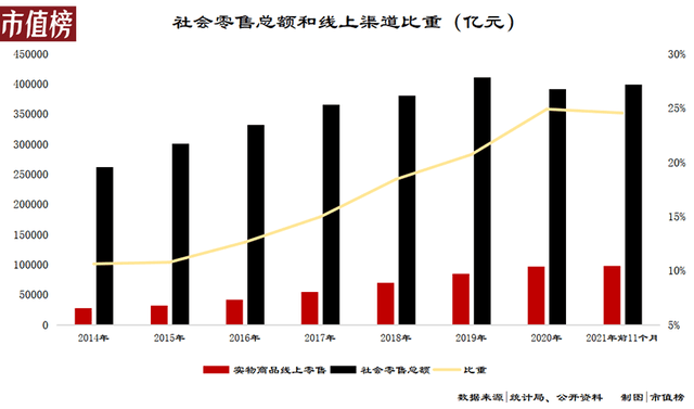 2019年,一面是拼多多在经过爆发式增长之后,仍然有翻倍的收入增速,一面是线上实物销售占社会零售总额的渗透率增速变缓,京东的收入增速只有不到25%。