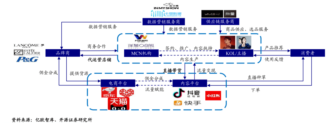 从亿欧智库研报中的直播关系图来看,串联起直播电商的有,品牌商、mcn机构、主播、消费者、平台、供应链服务商和数据营销服务商等,其中主播和签约主播的mcn机构为链接品牌商和消费者的桥梁,平台则提供流量和场地。