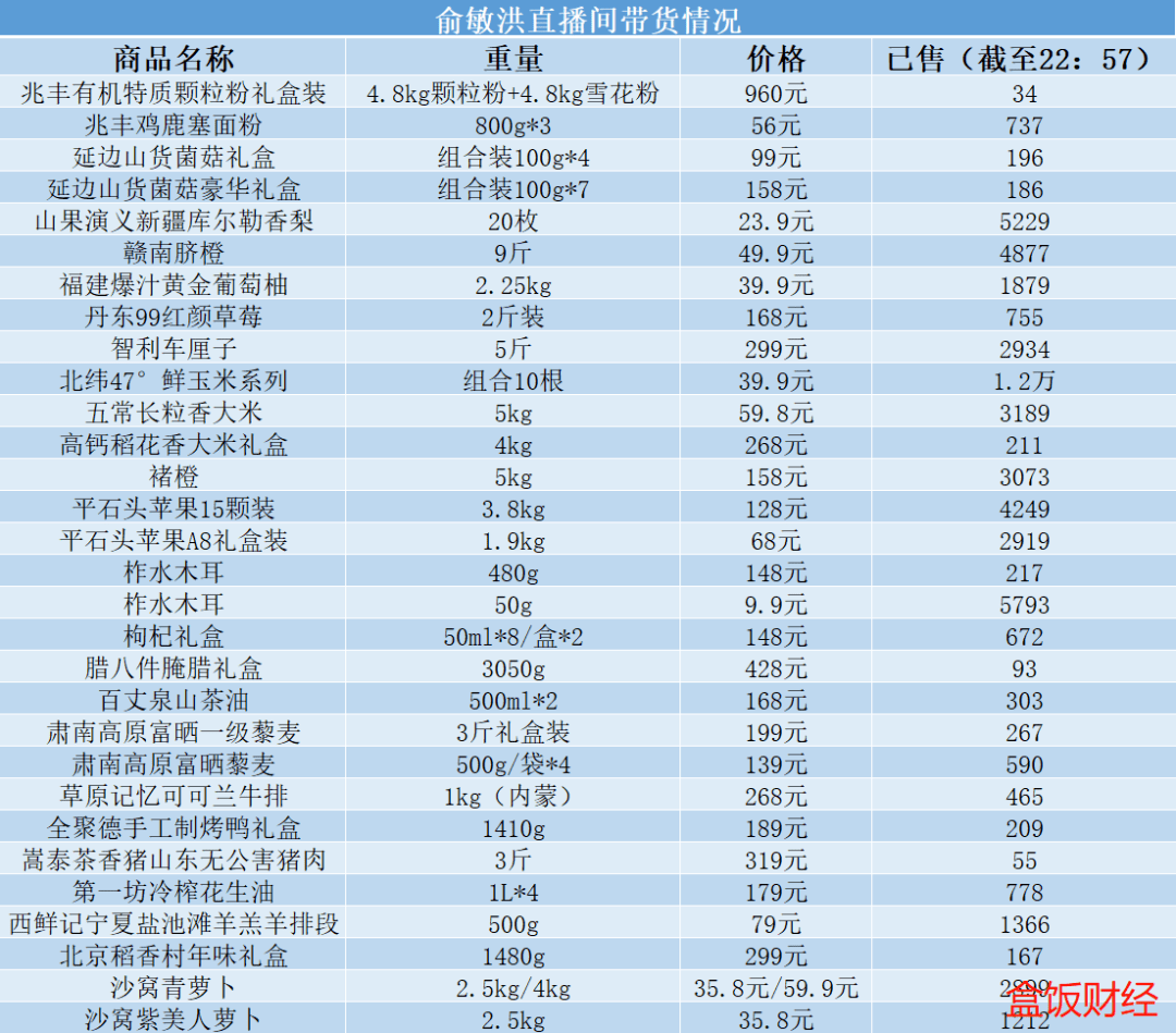 3小时的直播中,俞敏洪在自己的直播间共上线了30款产品,涉及品类以果蔬、粮油、生鲜等农副产品为主。其中有品牌产品全聚德、稻香村等,也涵盖不少从原产地直接精选的品质农物,比如智利车厘子、新疆库尔勒香梨、柞水木耳等。