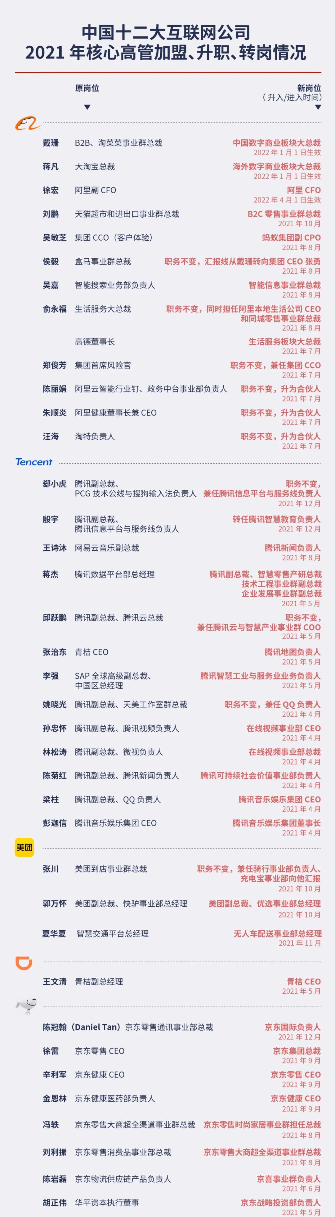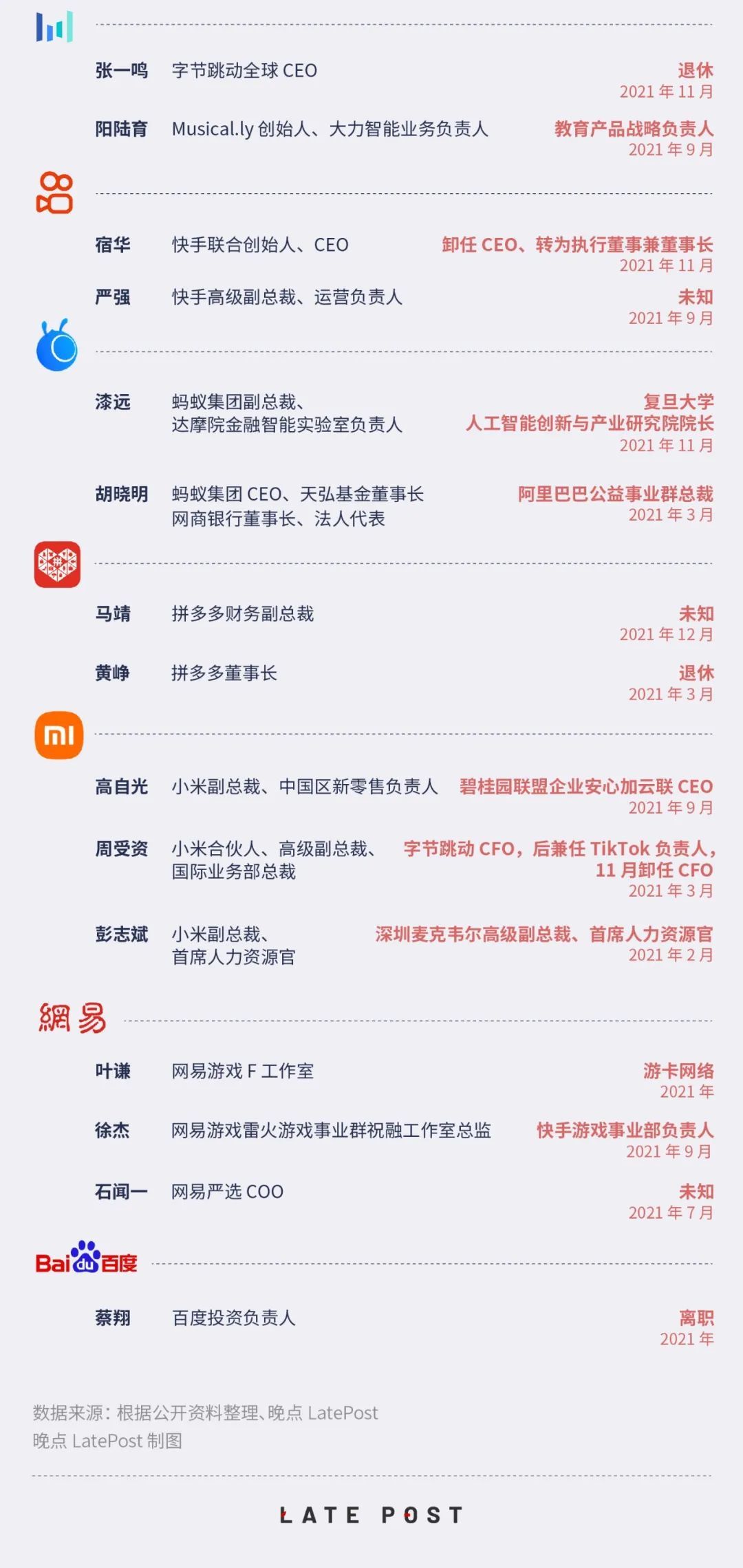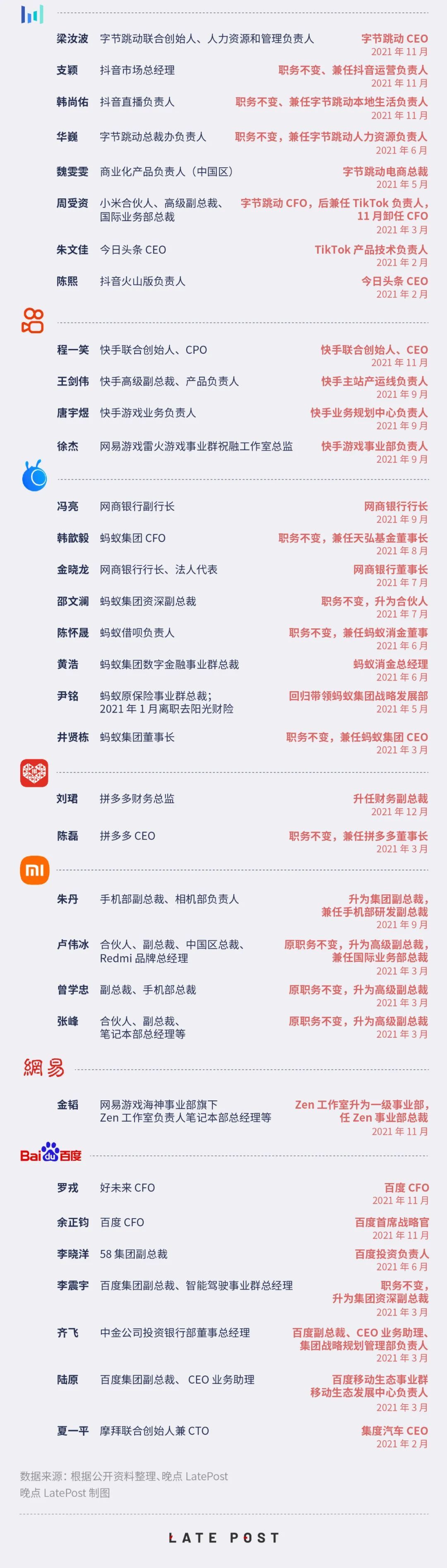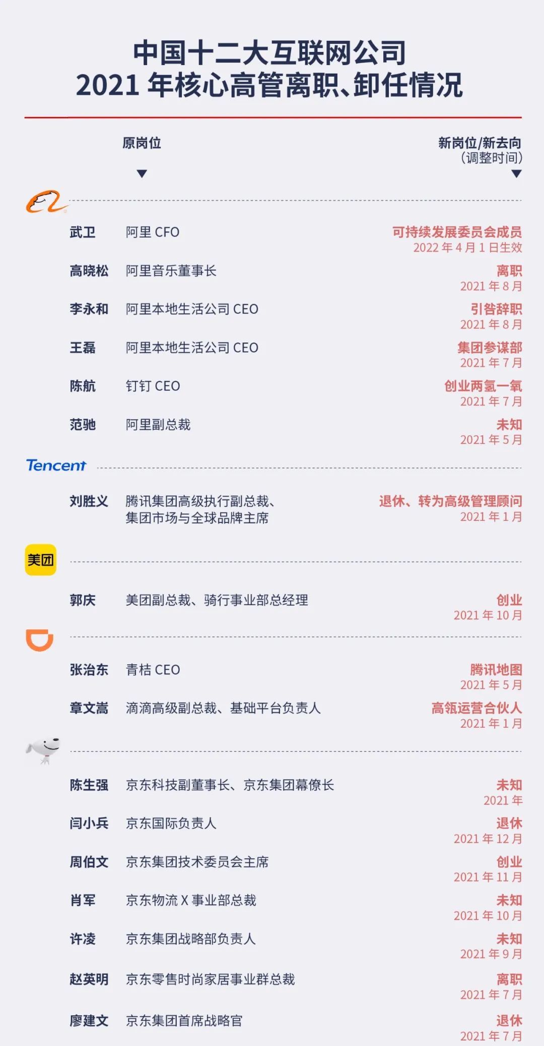 《晚点 LatePost》盘点了 2021 年这些公司核心高管的流动情况,核心管理层作为一家企业的决策中枢,他们的变动在一定程度上也影响着企业的未来走向。