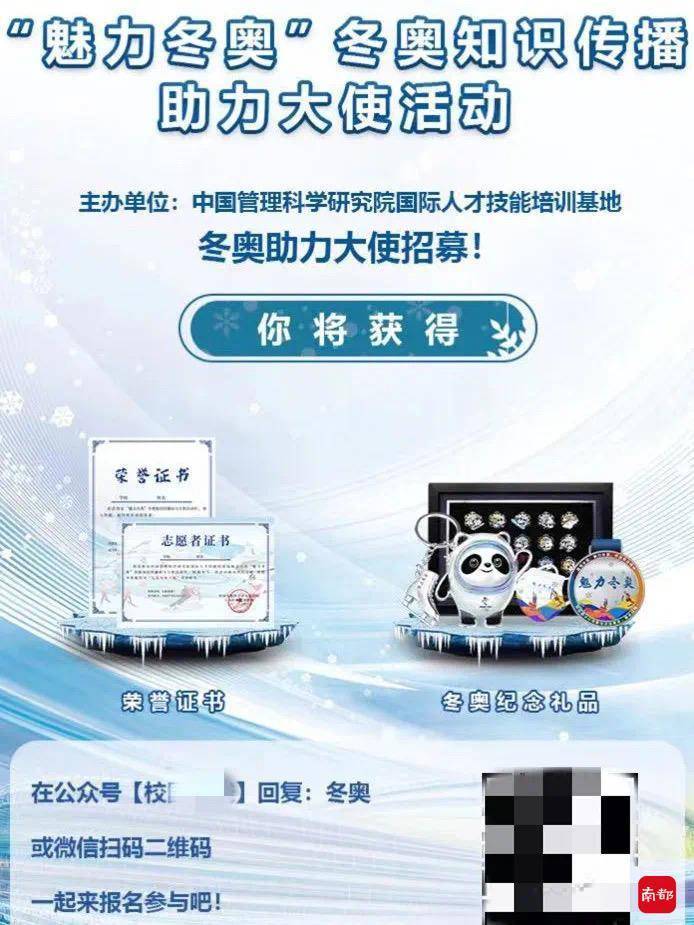 今年2月,北京的李女士(化名)在一个家长交流群看到一张“‘魅力冬奥’冬奥知识传播助力大使活动”的海报。发布者称“给孩子领个冬奥大使证书……小学生、中学生、大学生均可参加”,还称“可以作为孩子的社会实践”。