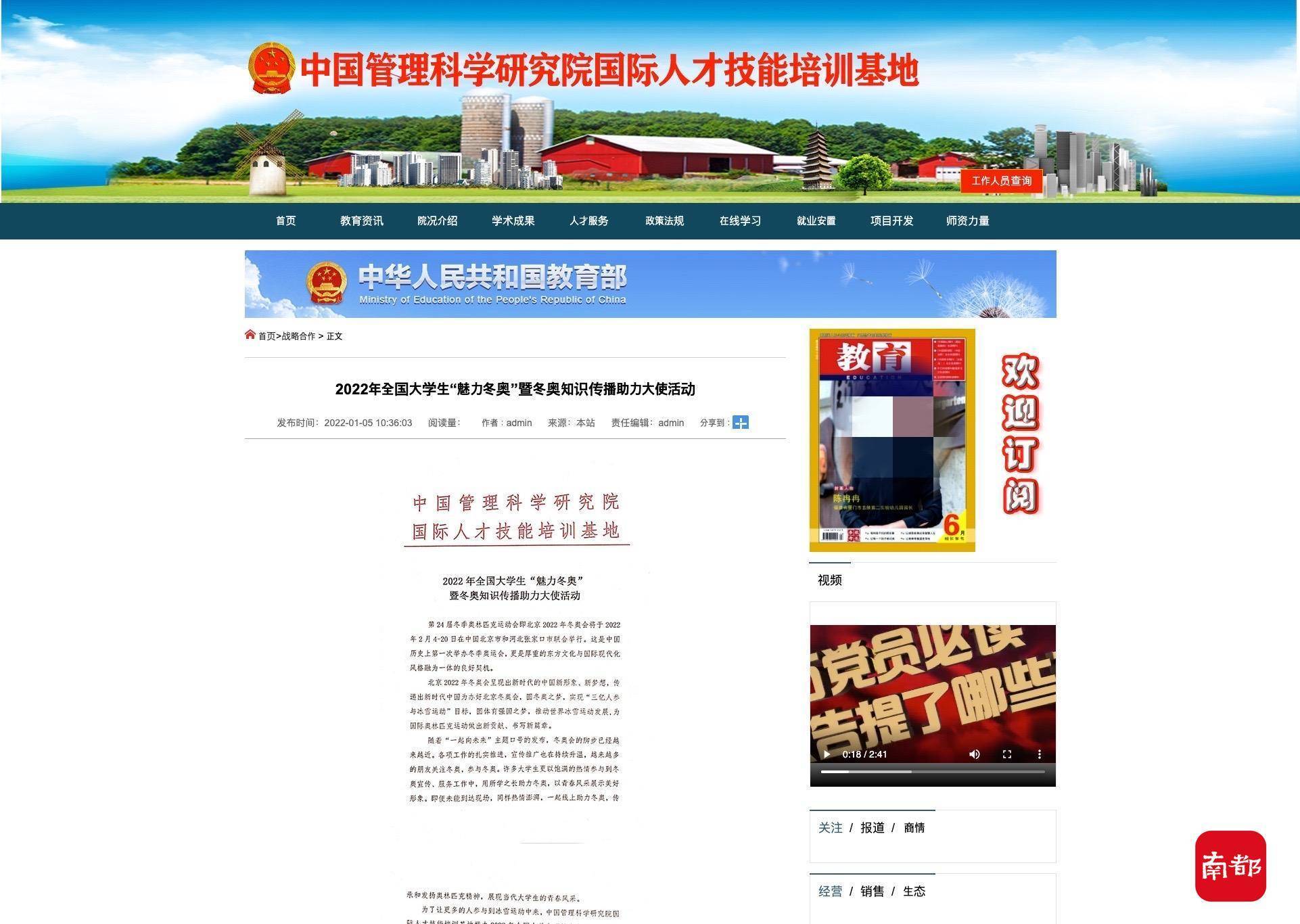 在活动主办方“中国管理科学研究院国际人才技能培训基地”官网,一篇名为《2022年全国大学生“魅力冬奥”暨冬奥知识传播助力大使活动》的文章中展示了一份关于该活动的“红头文件”,文章上方图片含有“中华人民共和国教育部”字样。但南都记者未在教育部官网搜到该文件。