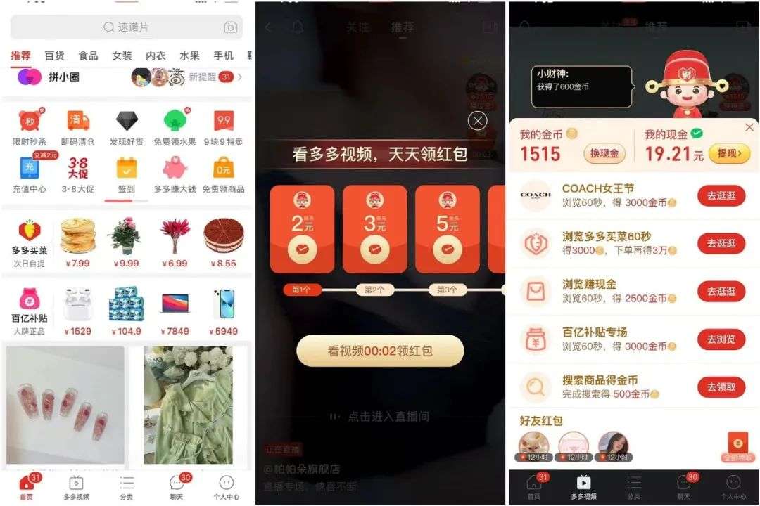 另外,为了吸引用户,多多视频推出了“看视频提现”的活动。具体玩法是首次进入页面,就能领到一笔奖励金;刚开始刷视频时,每看一个视频会得到2分钱的回报;浏览任务栏中规定的品类、商家页面达到一定时间,也有相应的金币激励……以上这些,都将通过微信提现的方式直接发放给用户。