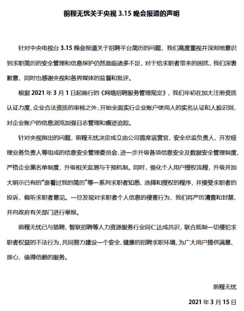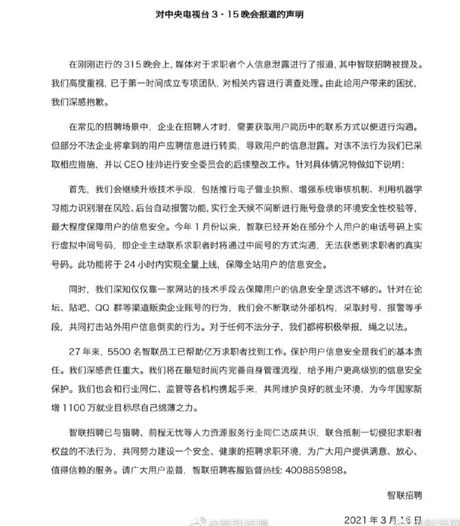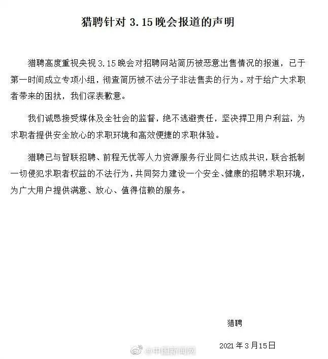 被曝光后,智联招聘、前程无忧、猎聘迅速回应。猎聘表示“彻查售卖行为”;前程无忧表示“成立安全管理委员会”;智联招聘表示“升级技术手段”。