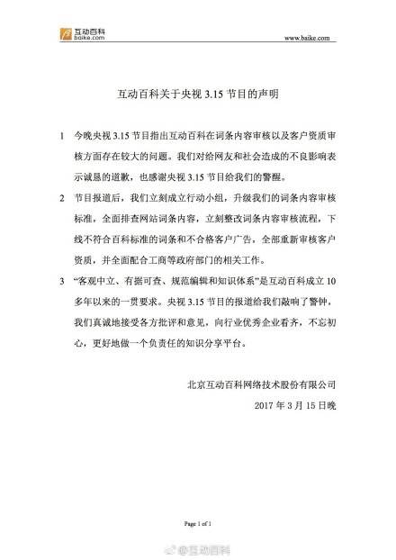 被曝光后,互动百科官方微博发表声明称,针对互动百科在词条内容审核以及客户资质审核方面存在的问题表示诚恳道歉,并排查网站词条内容,整改词条内容审核流程。