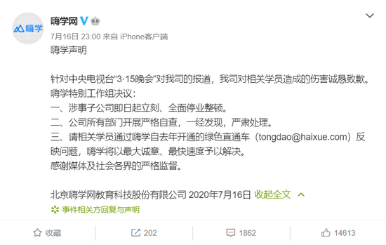 嗨学网是一家线上职业培训机构。被点名后,嗨学网回应表示,已成立特别工作组,目前正在对相关事件展开调查,对涉事子公司进行停业整顿。