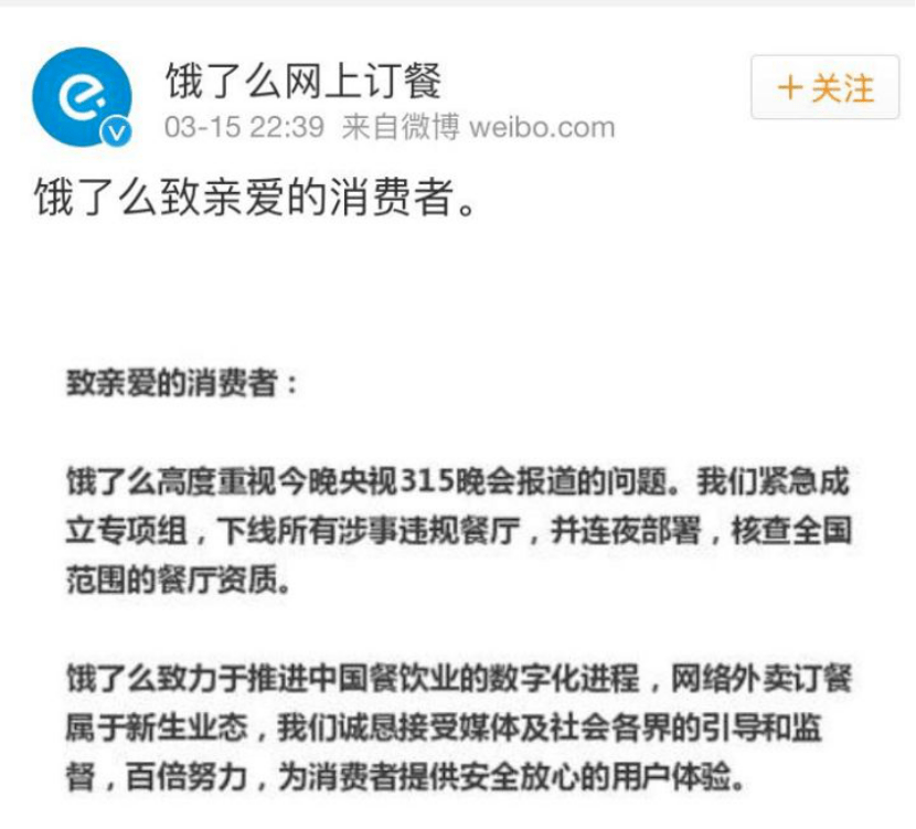 晚会结束之后,饿了么的回应姗姗来迟,官方发布“万能公关模版”回应,称饿了么高度重视央视3·15晚会报道的问题。将紧急成立专项组,下线所有涉事违规餐厅,并连夜部署,核查全国范围的餐厅资质。