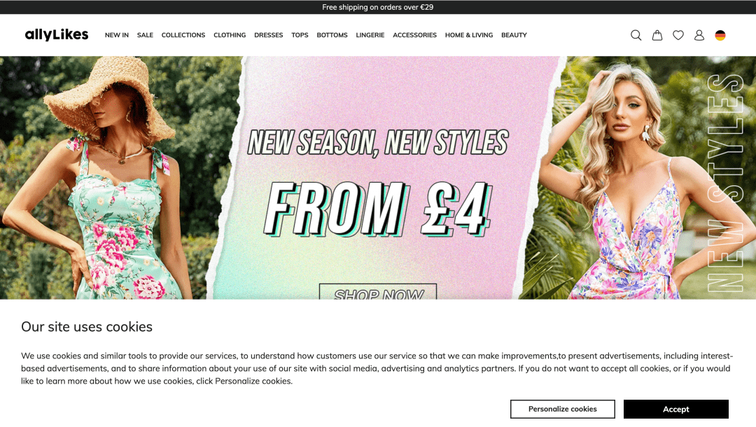 AllyLikes选择主攻利润更高的欧洲市场,女装售价多在10-40欧元之间,价格总体略高于SHEIN,也是谨慎求胜的体现。