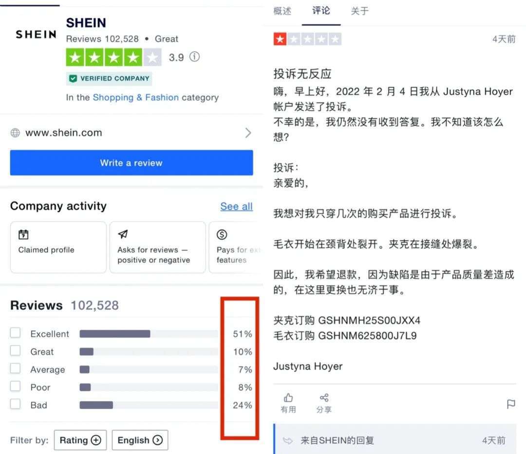 「新熵」发现,在电商点评服务网站Trustpilot上,海外消费者对SHEIN的评价高达10万余条,分数为3.9分(满分5分)。但评价两极分化十分严重,61%的用户给了4星和5星好评,32%的用户给了1星和2星差评,选择中间评价的用户相对较少。