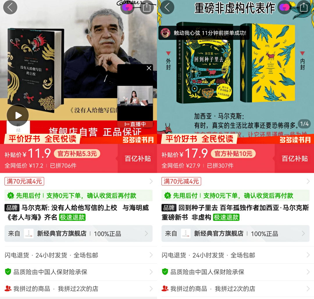 “像马尔克斯的书一般都是硬壳精装,一本起码50+元,但在多多读书月期间,正版只要十几元。”林杉说道。