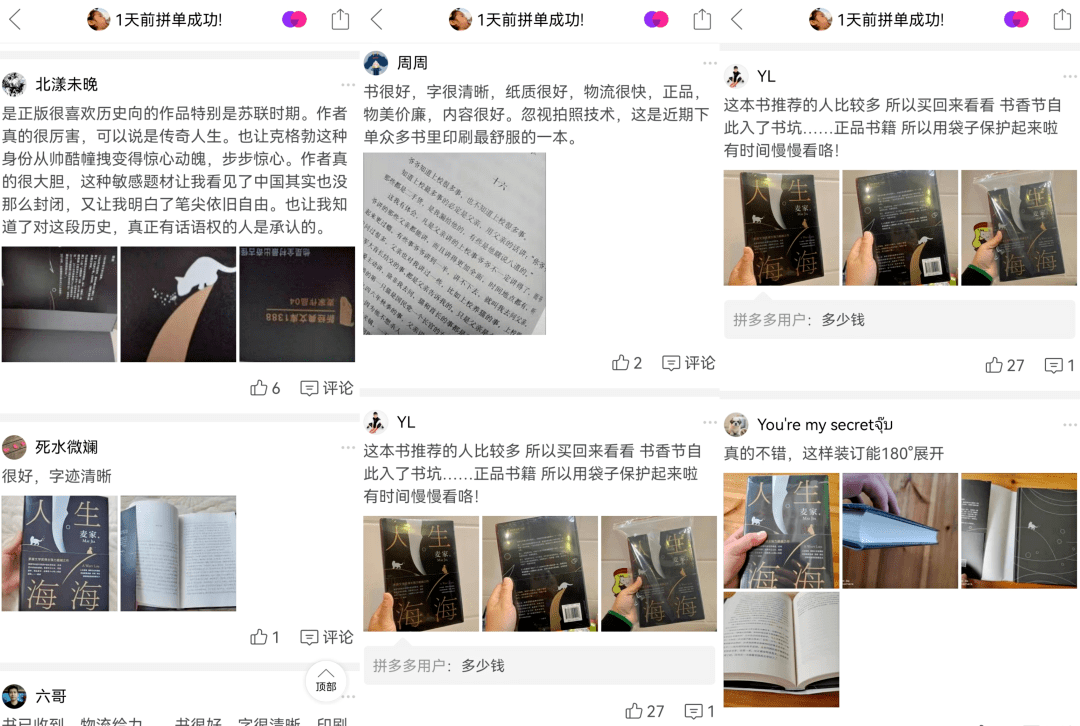 在拼多多某店铺售卖的《人生海海》评论区中,一些消费者在晒了买家秀的同时,还发布了自己的读书简评。