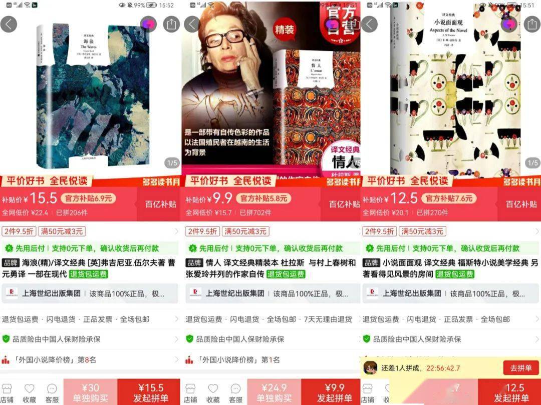 于是,在这个多多读书月,她趁着优惠买了上海译文出版社被称为“窗帘布”的译文经典系列书,包括《罗生门》、《局外人》、《1984》、《动物农场》等文学经典。这些书全部来自上海世纪出版社官方旗舰店,不仅有正品保证,补贴力度也十分诱人。