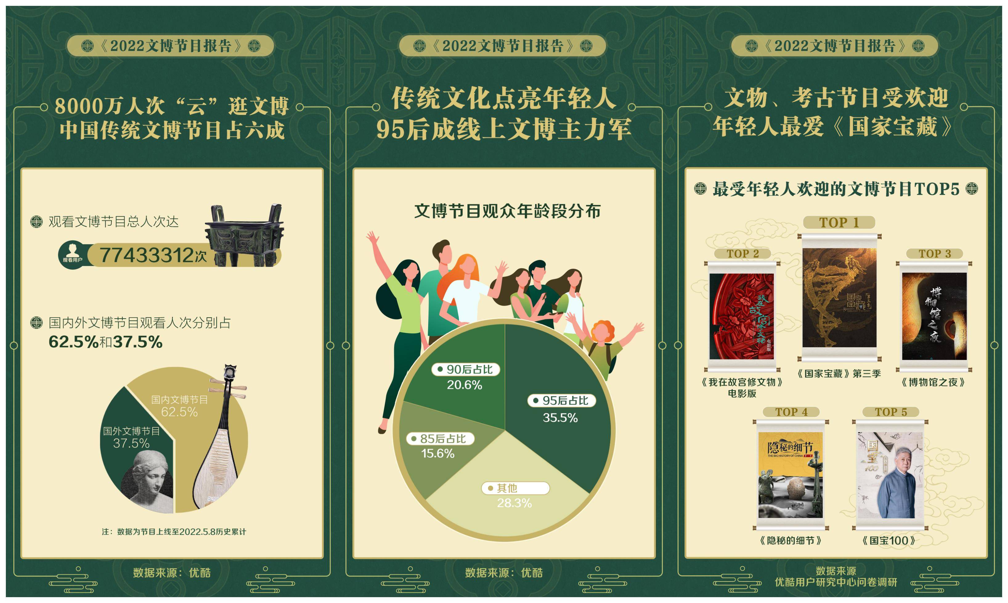 5月18日国际博物馆日,优酷发布《2022文博节目报告》(以下简称《报告》)。《报告》显示,近8000万人次“云”逛文博,其中六成热衷中国传统文博节目。95后成文博节目的观看主力军,超六成年轻人认为,文博节目弘扬传统文化,兼具知识与趣味,有获得感,亦是学习传统文化和历史的窗口。