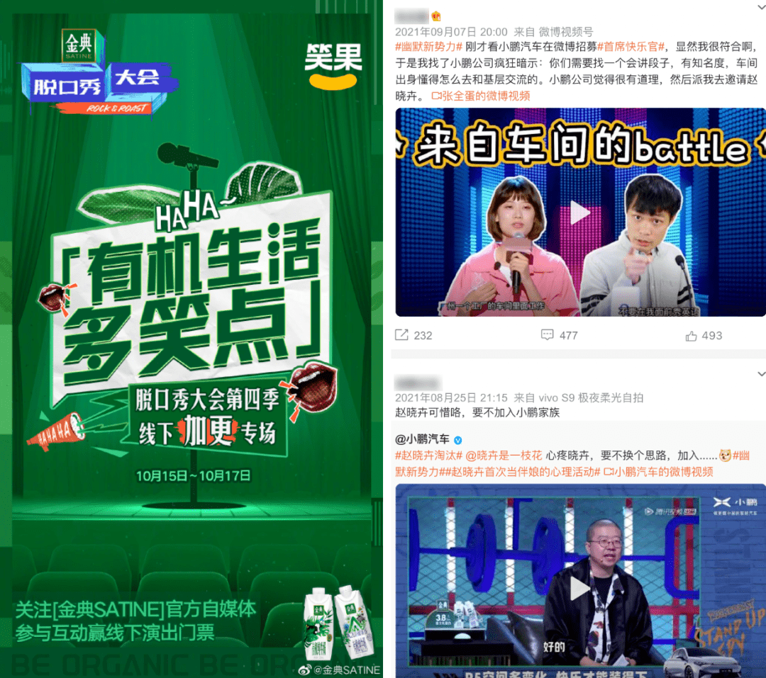 在饮品品牌金典与汽车品牌小鹏和脱口秀大会系列的合作中,金典一面在节目内结合品牌信息定制专属创意广告,将品牌植入与脱口秀表演结合实现用户种草;一面在节目外,进行私域互动、选手直播,开设品牌线下定制专场,结合脱口秀文化表达方式和文化场景延续话题声量,实现破圈。而小鹏汽车,除了在IP内进行营销植入外,还联合节目嘉宾在社交媒体上围绕节目热点进行爆梗营销。