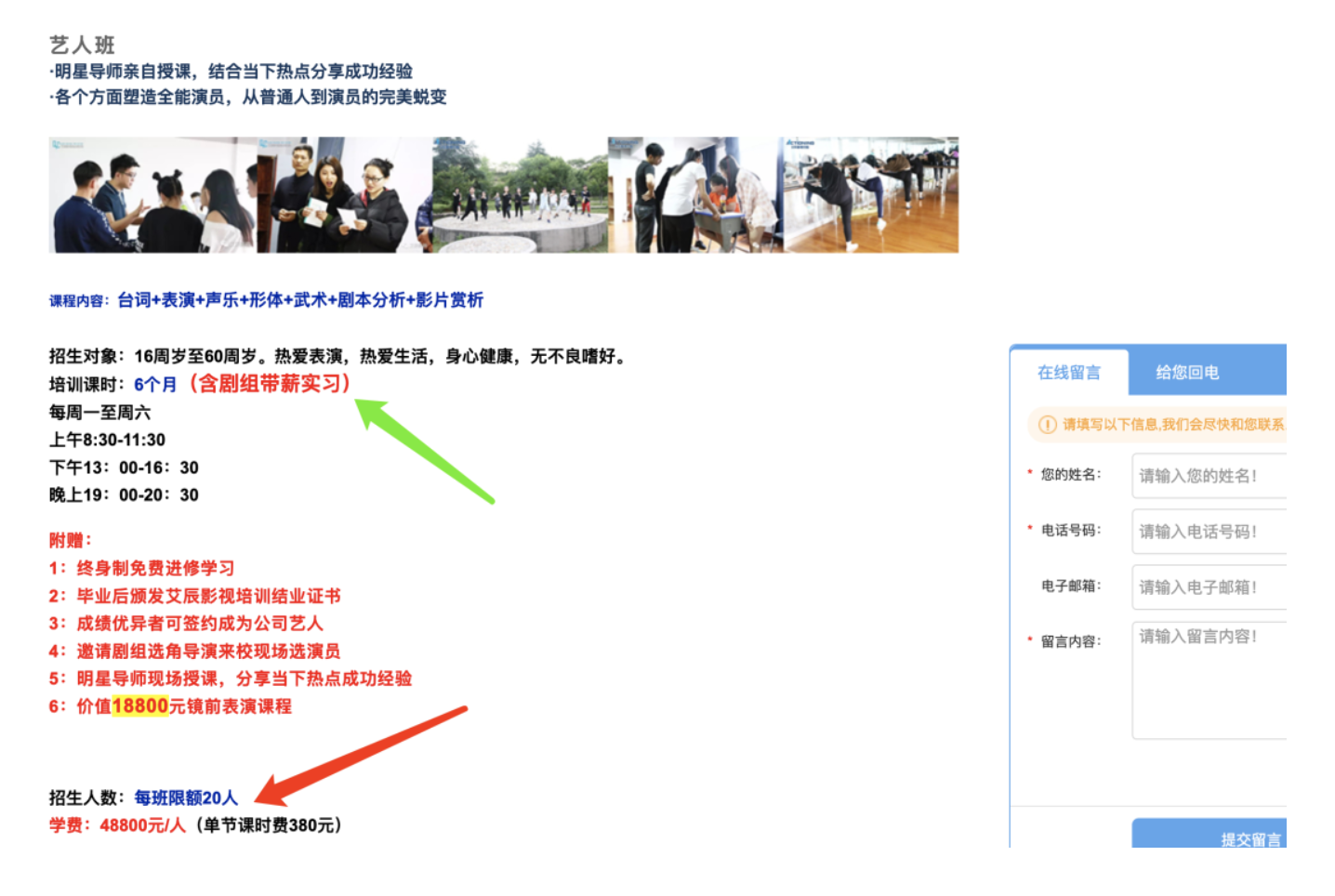 就上述公开信息来说,该机构确实存在知名演员或者是专业表演老师教学的班级,也存在包进剧组的案例,但前提是学员需要缴纳“4万+、8万+”的学费才能享受到这一待遇,而那些缴纳“8千+、1万+”学费的学员并没有这类课程,只能进行初级的表演训练。