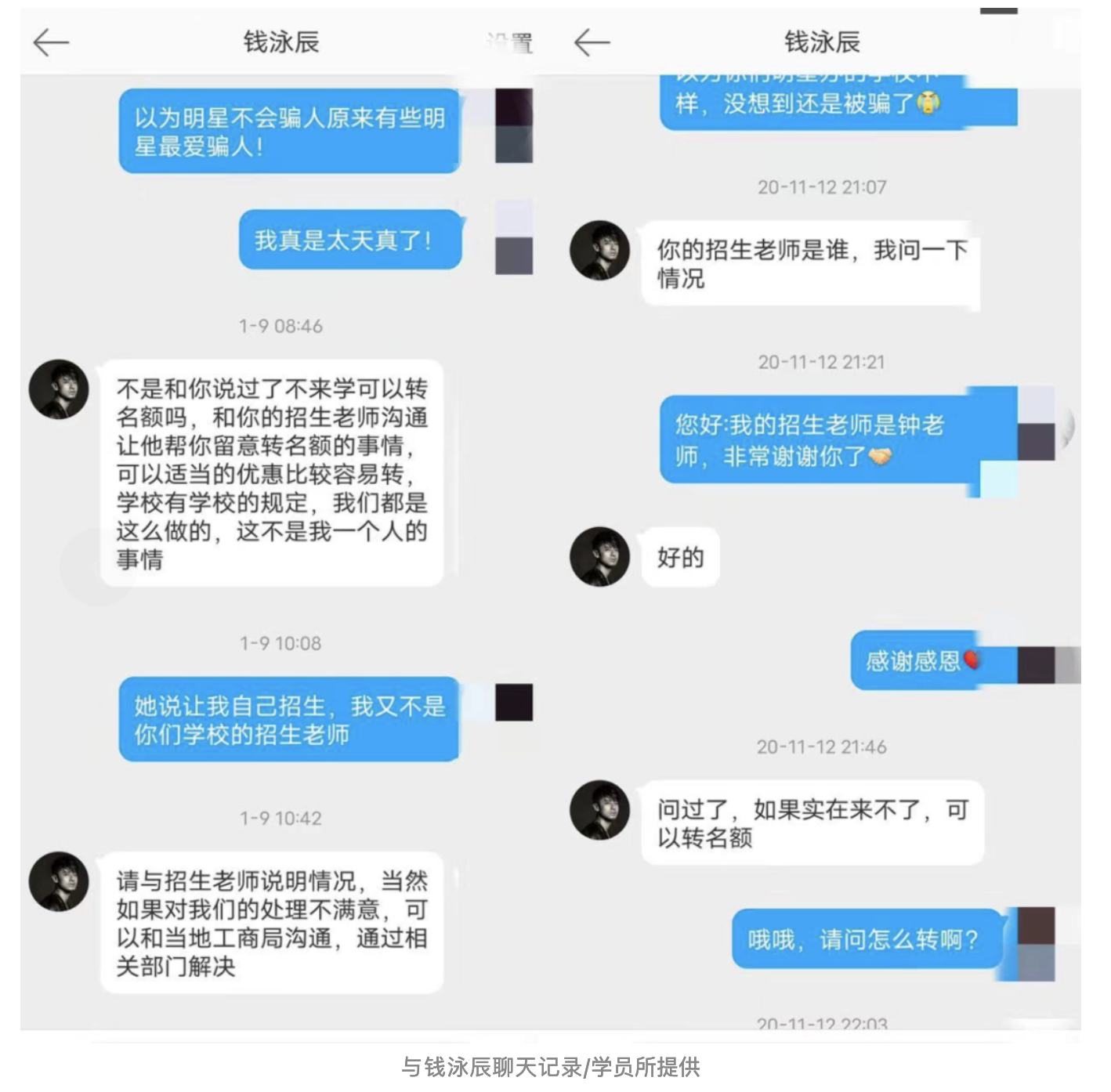 第三位接受采访的学员是于2020年在一次与钱泳辰的见面会上报的名,她说道:“当时因为明星在所以头脑一热交纳了12000元的定金,钱泳辰还给我签了名,事后后悔了才发现机构拒绝退还定金,还表示如果不想上课可以将名额转让给其他人。”
