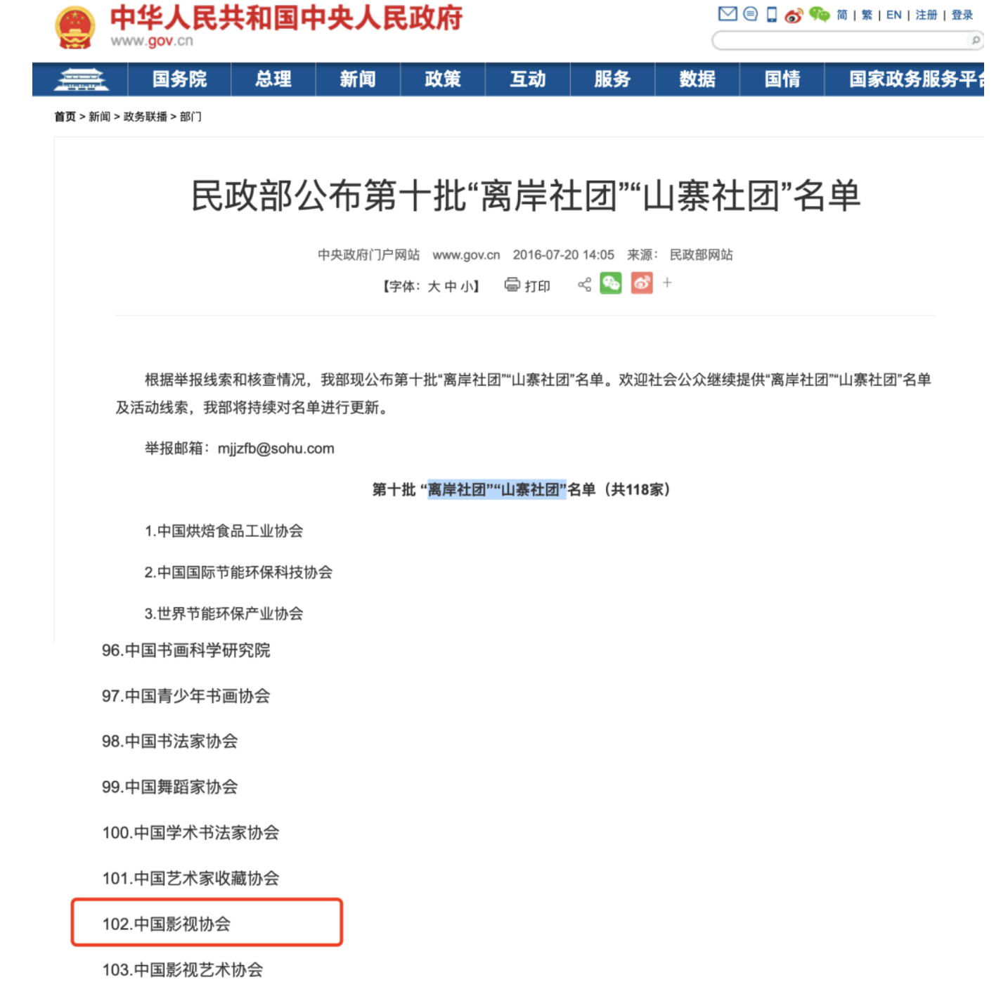 然而记者查询发现,2016年7月,民政部公布的第十批“离岸社团”“山寨社团”名单,中国影视协会在名单中。