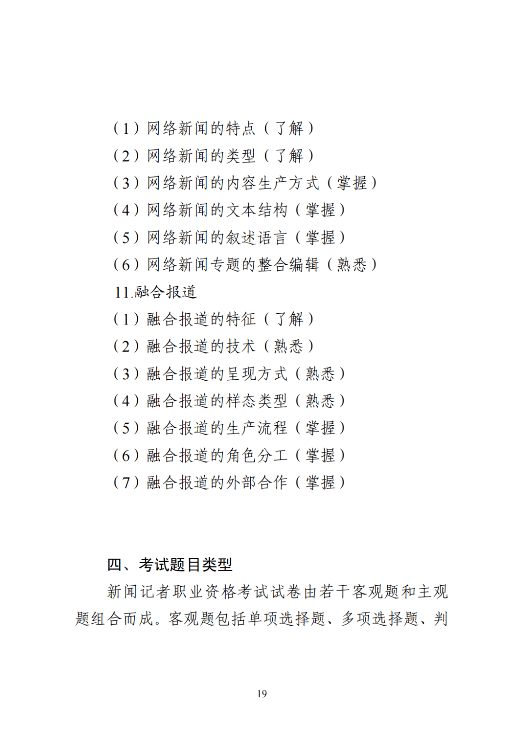 新闻记者职业资格考试试卷由若干客观题和主观题组合而成。客观题包括单项选择题、多项选择题、判断题等题型,主观题包括问答题、论述题、写作题、综合题等题型。2个科目试卷总分值均为200分,客观题与主观题的分值各占卷面总分值的50%。某些题型根据不同专业方向设置不同内容试题,分值相等,难度相当,供应试人员选做。