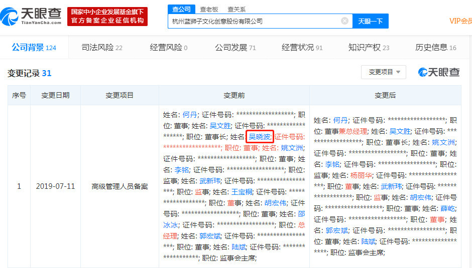 7月14日消息,据天眼查数据显示,杭州蓝狮子文化创意股份有限公司高级管理人员备案于7月11日发生变更,吴晓波、王宝桐退出董事行列,吴晓波妻子邵冰冰卸任总经理,新增董事杨丽华,何丹由董事变更为董事兼总经理。