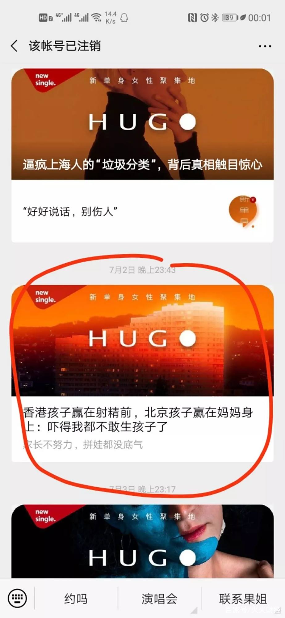 7月22日晚间11点许,公众号“HUGO”的资料页面显示已自主注销账号,停止使用,其最新更文停留在昨晚。