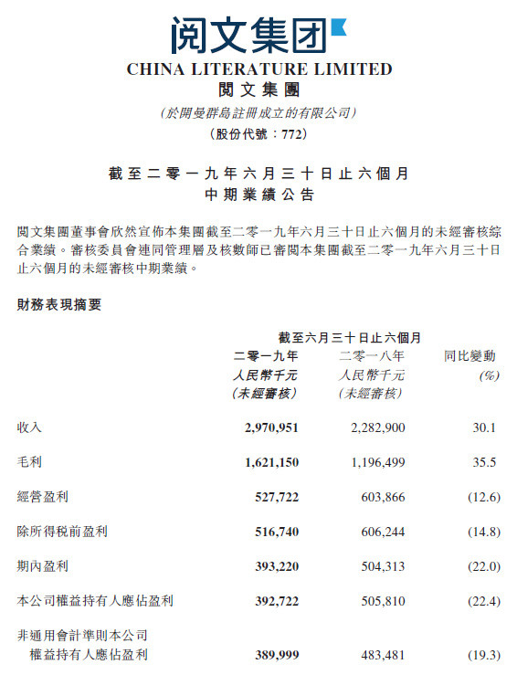 8月12日,阅文集团公布了2019上半年业绩报告,报告显示,阅文集团2019上半年实现总收入29.7亿元人民币,同比(较上年同期)增长30.1%;报告期内盈利3.93亿元,同比下降22%。其中,在线业务收入16.6亿元,版权运营收入同比大增280.3%至12.2亿元。