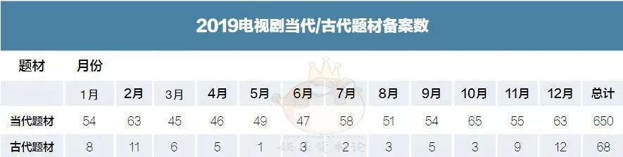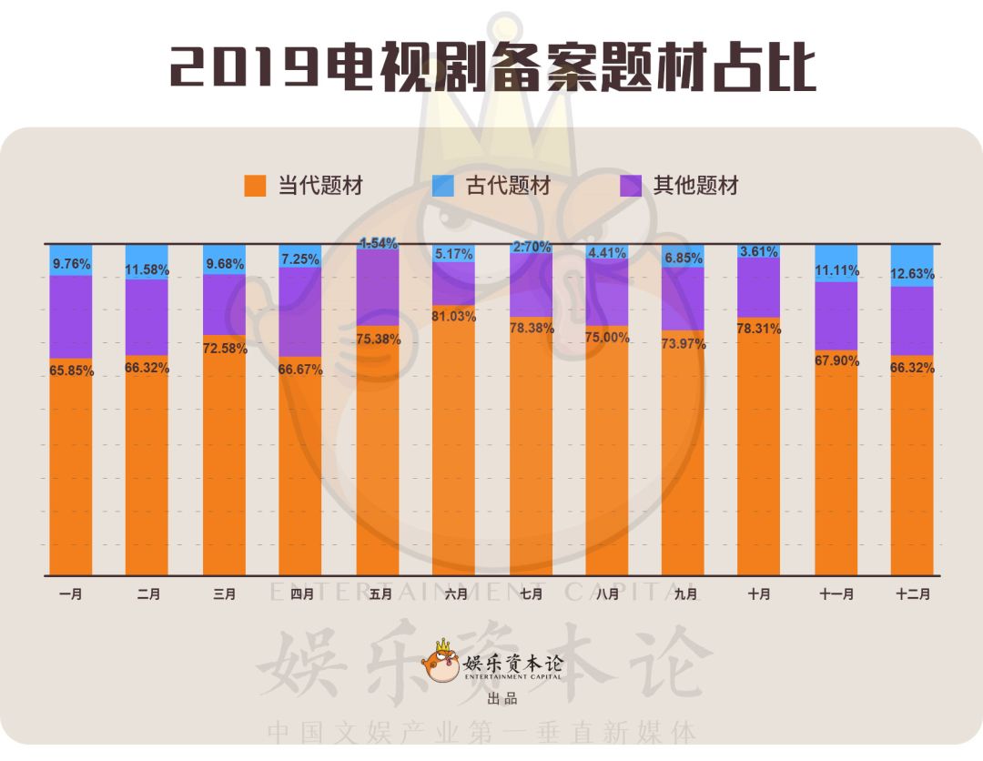 这种趋势贯穿了全年,整体看,2019年当代题材总部数650部,占比71.8%;古代题材每月占比基本在10%上下,全年只有68部,总占比7.8%。