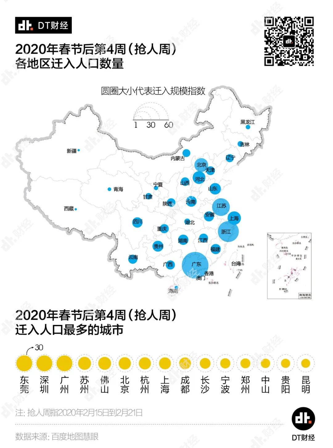 所以很多省市开始坐不住了,开始在全国各地复工。除了我们开头提到的来自长三角的努力,成都、佛山、江门等地相继取消复工审批程序;广东已开展点对点专车服务近200班次,为300多家重点企业有组织输送到岗6108名员工……各种招式层出不穷。这些地区的努力确实取得了一定成果。百度迁徙数据显示,浙江省在2月9日的全国热门迁入目的地排名中还只处于第18位,之后的每一天,其排名都在上升,到了2月18日,浙江已经是全国第2热门的迁入地了。如果说浙江是复工工作进步最大的省,那么广东就一直站在复工排行榜的顶端——在浙江向热门迁入地一步步攀爬的这些天,广东稳居热门第1的位置,岿然不动。我们特别统计了春节后第四周(2月15日-2月21日)各省市迁入人口的规模,在复工周迁入人口数量最多的5座城市中,有4座来自广东。
