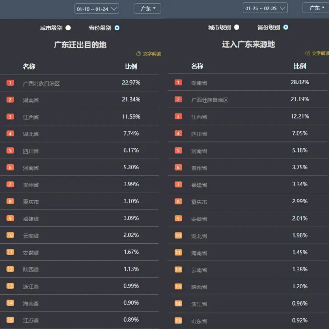 当各地还在傻傻等着员工来上班,珠三角和长三角的城市们打响了复工的头枪:符合条件?马上办;买不到口罩?政府派专人联系采办;村里县里不放人?政府出面协调办;员工自行返回?路费全报销;企业招到新员工?有补贴。包车、包列、包专机更是常规操作——杭州掏钱包下高铁专列,从贵州、四川、安徽等地拉回返工人员;嘉兴嘉善县为了助企业复工招工,包下专机;南京对包车组织返岗的企业,补贴50%包车费用……在一系列努力过后,大家的复工情况到底如何了?受疫情影响,湖北、河南,对各地的影响到底有多大?亟待开工的制造业大省们,从何处填补劳动力缺口?DT君整理了近期人口流动的数据,尝试剖解制造业大省们的用工困局。