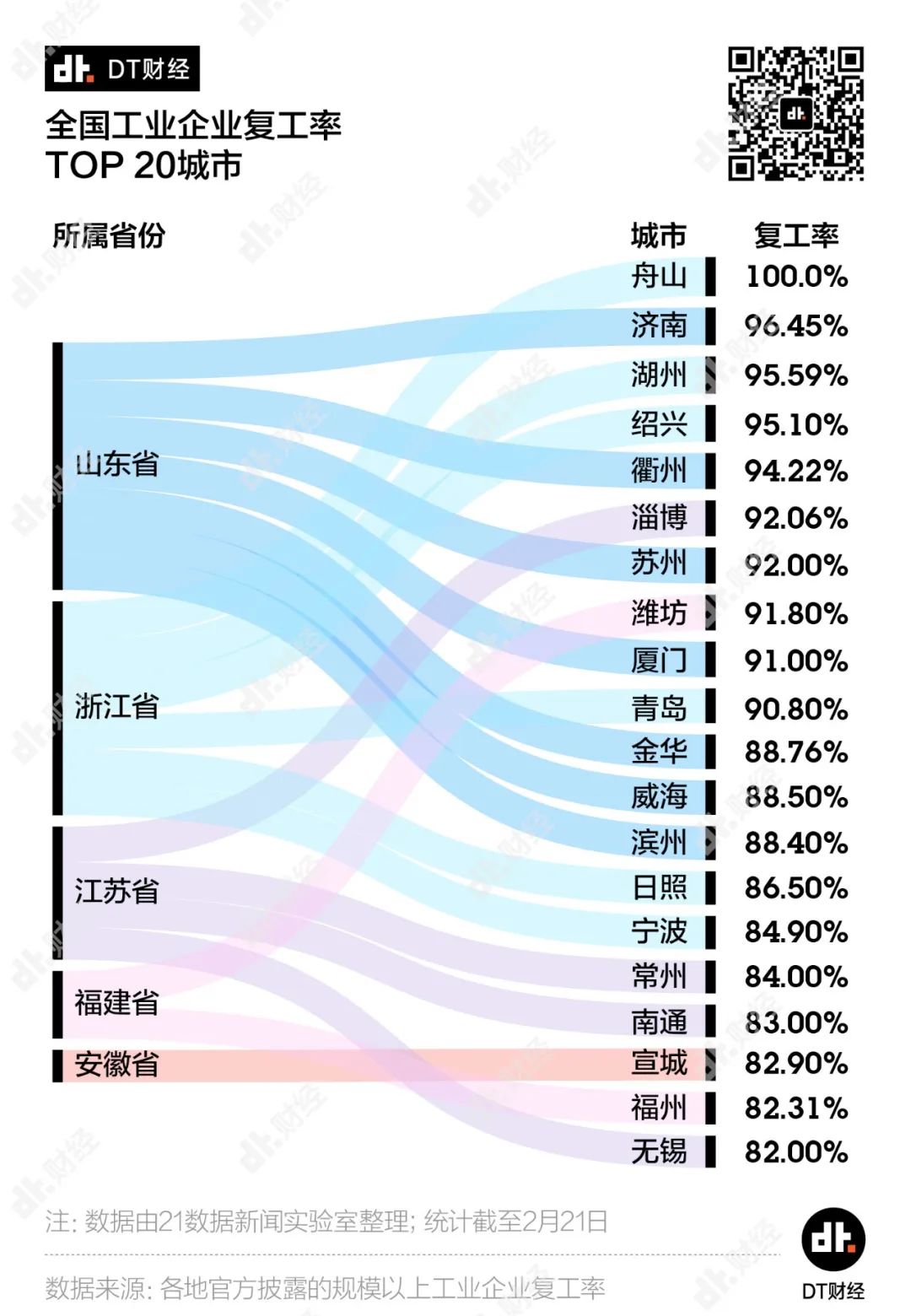 而这些受影响最大的省份,正好都是最先开始吹响复工号角的地区。在疫情下停工停产的制造业,每一天损失的都是真金白银。我们在《各行业抗疫大调查》一文中也写到过,以东风汽车2019年中报为例,一个月不开工,差不多要少生产22万辆汽车,价值约 80亿元。跟还要考虑天时地利人和的服务业不太一样,制造业只要有工人,就能恢复生产,早日复工,就能早点把停工停产的损失补回来。生存压力之下,制造业企业密集的东南沿海地区竞相复工。据21财经统计,截至2月21日,全国规模以上工业企业复工率前列的省份有山东(复工率79.40%)、福建(75.8%)、江苏(75%)、浙江(72.20%)、辽宁(71.30%)。广东复工率较低,略大于50%。再看复工率前二十的城市,也大多属于浙江省、山东省和江苏省。其中,舟山379家规上企业和84家重点外贸企业已全部复工。