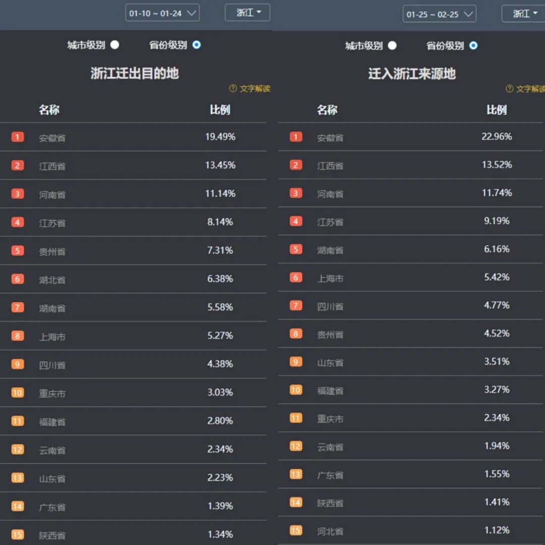 (图片说明:春节后迁入浙江的来源地,图片来源:百度迁徙)