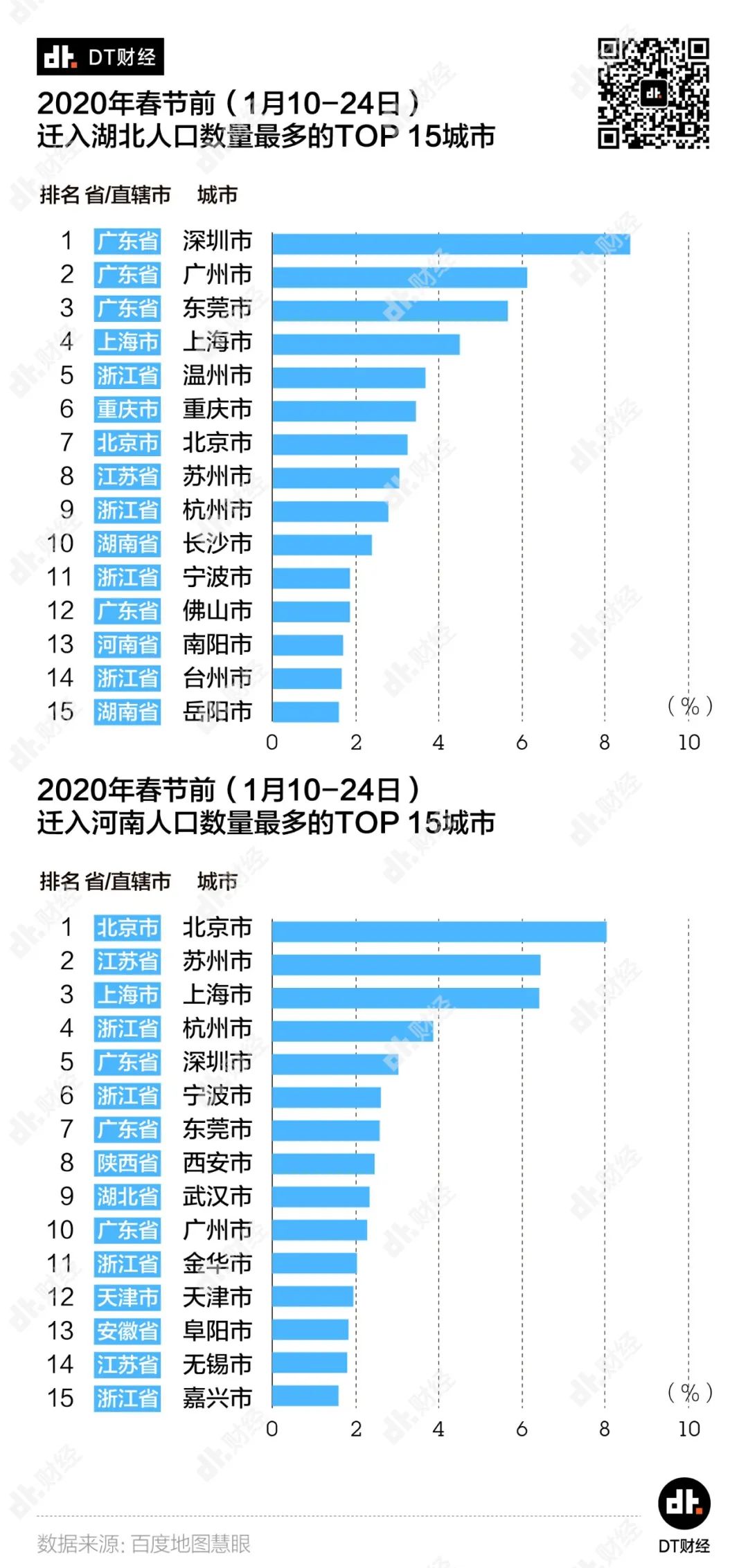 疫情开年,湖北和河南严控人口流动,这给制造业密集的东南沿海地区带来很大的困扰。湖北和河南都是劳务输出大省。在2010年第六次人口普查时,河南、湖北就已经分别是全国第3、第5人口输出大省,分别向其他地区输出了862.6万人、589.0万人。两省外出人口主要分布在广东、浙江和江苏——正好就是最近着急复工的长三角、珠三角大省。这种人口输出大省的地位,在10年后的2020年也没有太大变化。从百度迁徙的数据来看,2020年春运大军中,有7.64%从全国各地回流至河南,4.74%回流至湖北。而在春节之后的这段时间,他们中的相当一部分人被困在家乡,或因高速路被封而无法出城,或因老家农村已挖土封路,只能躺在家、听村支书在广播里暴躁喊话。这两个大省人口流出不同程度受阻,哪些城市受影响最大?从百度的数据可以看到,春节前两周,回到湖北的人口最多来自于深圳、广州和东莞,合计占湖北迁入人口的20%以上;可以理解为,湖北对外输出的人口中,最多地去了这3座城市。而春节前两周回到河南的人口最多来自北京、上海和苏州。可以看到,湖北人主要是向南方走,而河南人多往东部和北部去。