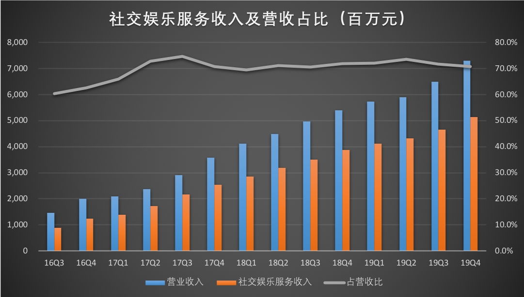 社交娱乐服务及其他服务是依旧是腾讯音乐的主要收入来源,一定程度上可以视为腾讯音乐的营收支柱。财报显示,四季度该部分收入51.5亿元,同比增长32.9%,占总营收的70.7%,社交服务收入超在线音乐服务收入2.4倍。腾讯音乐表示,该项收入的增长,主要受在线卡拉OK业务(全民K歌)和直播服务增长所推动。