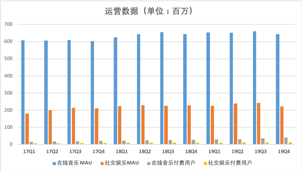 不过,从整体用户数据来看,腾讯音乐移动月活增长停滞,甚至出现环比下滑的情况。财报显示,腾讯音乐第四季度在线音乐服务的移动MAU为6.44亿,同比与去年持平,较上一季度的6.61亿,下降2.6%。社交娱乐服务的移动MAU为2.22亿,同比下降2.6%,较上一季度的2.42亿,下滑8.3%。
