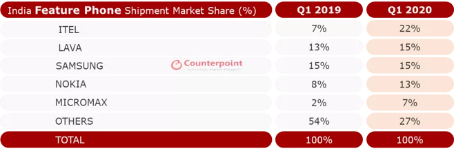一季度印度功能机市场排名。图片来源:Counterpoint