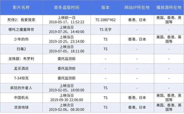 2019年侵权量TOP10电影首条盗版链接信息. 数据来源:12426版权监测中心