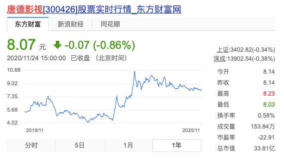 唐德影视毫无疑问是过去数年受库存剧影响最大的上市影视公司。截至日前,唐德的股价8块左右,不到最高值的5分之一。