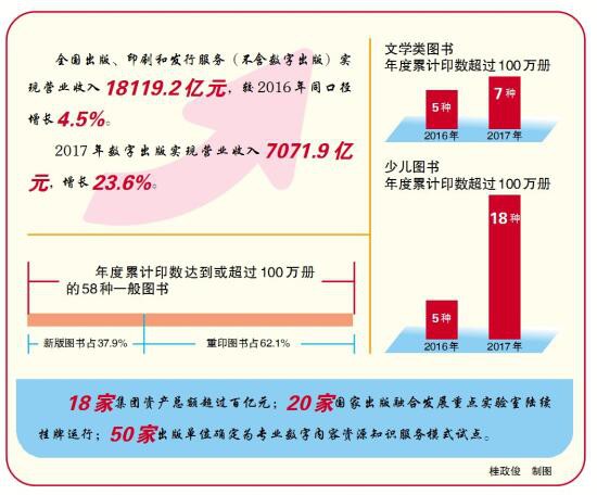 本报讯 (记者尹琨)7月27日,国家新闻出版署发布《2017年新闻出版产业分析报告》。《报告》显示,2017年,新闻出版产业规模、效益稳步提升。全国出版、印刷和发行服务(不含数字出版)实现营业收入18119.2亿元,较2016年同口径增长4.5%;拥有资产总额22165.4亿元,增长3.0%;利润总额1344.3亿元,增长2.7%。另据中国新闻出版研究院调查汇总数据显示,2017年数字出版实现营业收入7071.9亿元,增长23.6%。