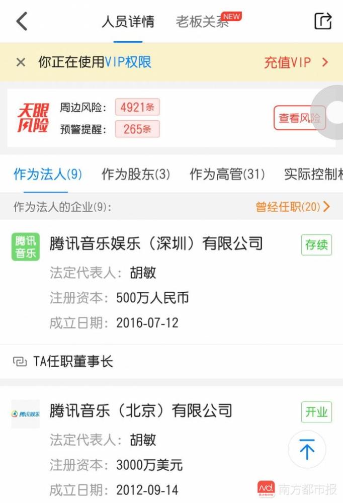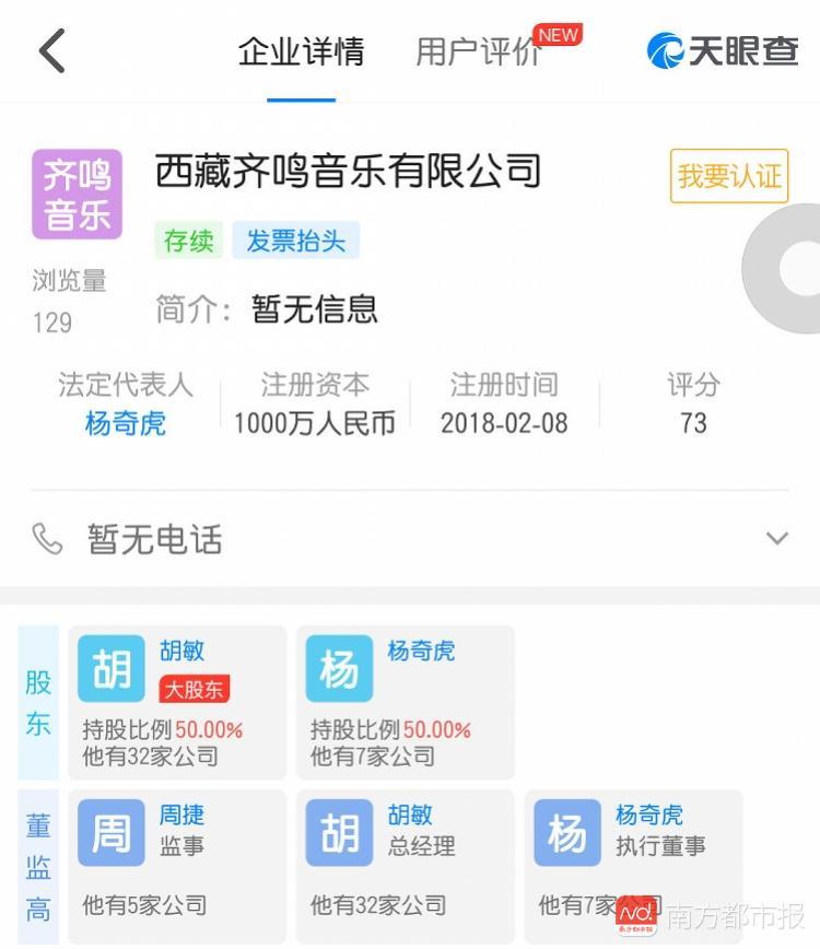 投资方中的齐鸣音乐被认为与腾讯关系密切,主要是因为其股东均在腾讯音乐中担任要职。天眼查数据显示,齐鸣音乐目前只有胡敏和杨奇虎两大股东,两人的持股比例也是少见的平均分配,各占50%。公开信息可知,胡敏目前为腾讯音乐CFO,杨奇虎为腾讯音乐的总经理。而该公司成立于2018年2月8日,成立时间不到半年。