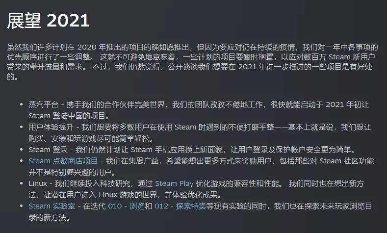 1月14日,平台母公司Valve在Steam社区发布《2020年度回顾》,其中“展望2021”板块提及与完美世界合作的“蒸汽平台”将在2021年年初登陆中国。这是自“Steam中国版”公布以来,首度由官方宣布该平台的上线时间。