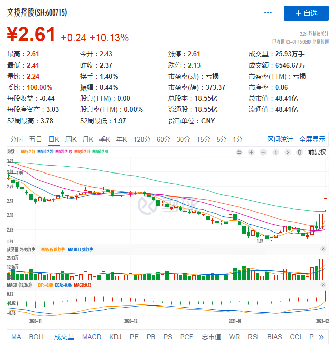 有趣的是亏损最高的万达电影和文投控股,在2月1日股价涨得最欢,其中万达电影收于23.25元/股,涨幅达到8.39%;文投控股收于2.61元/股,涨幅达到10%。