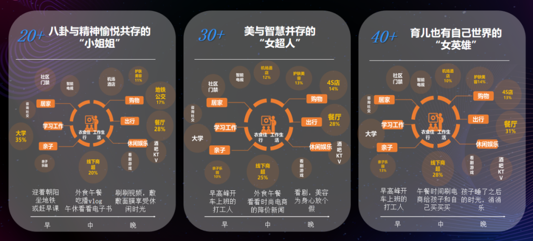 相比30~40岁女性,20岁+女性的线下生活场景更多的集中在大学、餐厅、线下商超和地铁公交等公共场所,而30~40岁女性在公共场所的频率则逐渐减少,但增加了4S店、机场酒店和亲子乐园三个地点,与此同时,餐厅、商超在线下生活中的比重也进一步增加,家庭化趋势明显。