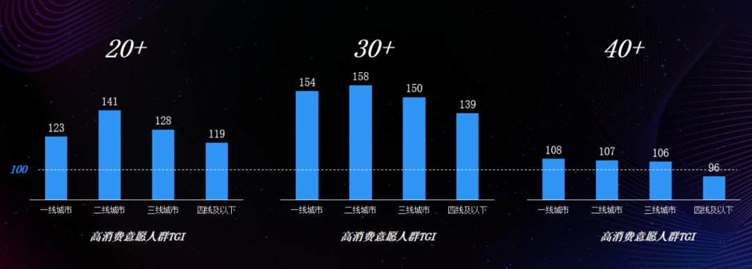 简单来说,TGI指数分析就是目标群体在特定研究范围内的数据反映,大于100代表超过平均水平,结果显示,绝大多数20~40岁左右的看剧和综艺的女性都有着强烈的消费意愿,并且受地域的影响很小。