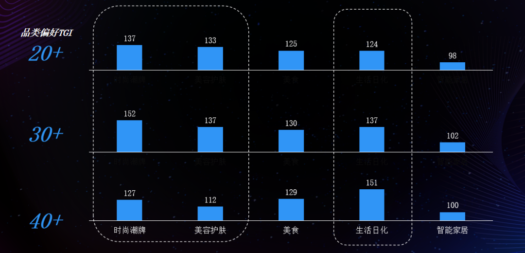 根据报告中结果显示,排名前五的品类都是以生活、家庭导向为主,凸显出各年龄段女性对生活品质普遍存在很高的追求,但随着年龄增长,品类偏好逐渐由个人化向家庭化发展,但美食和智能家居类受该因素影响较小。