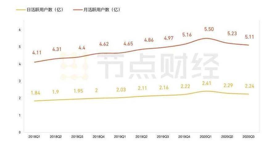根据最新财报显示,2021年3月,微博月活跃用户数达5.3亿,同比下降4%,环比增长2%;平均日活跃用户达到2.3亿,同比下降5%,环比增长2%。如图所示,从2018年Q1-2020年Q3,无论是日活跃用户数还是月活跃用户数,微博的增长都趋近平缓,只有疫情期间增长明显,随后便回落。