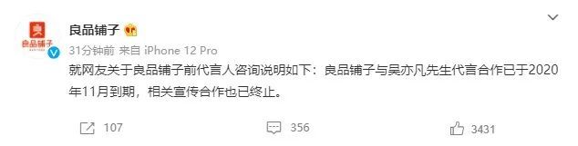随后,良品铺子也发微博称,与吴亦凡的合作已经于去年11月到期。