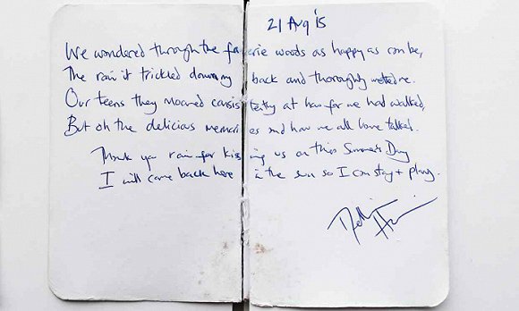 这些诗作有的表达了支持脱欧,有的表达了反对脱欧,其中还有结婚计划。“有些人是坐下提笔就写,你可以看出来他们写作时的思路。一开始的时候,他们也不知道自己最后要抵达至何处。我认为最感人的那些是一些人独自在这里行走,没有伴侣在身旁,因为他们的伴侣太过虚弱,或者已经离世了”,杰利说,这个项目就是一封“写给埃克斯穆尔的情书”。